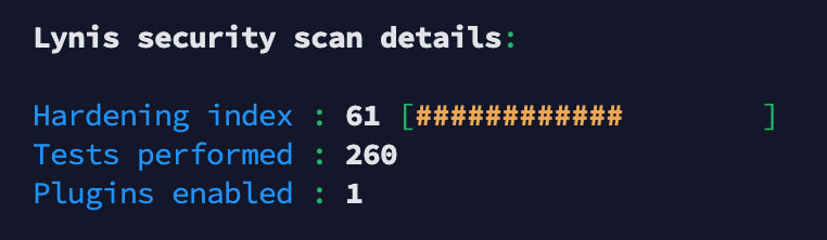 Lynis - это тренер. Он показывает слабые места в настройках. Стремитесь к индексу хотя бы 70.