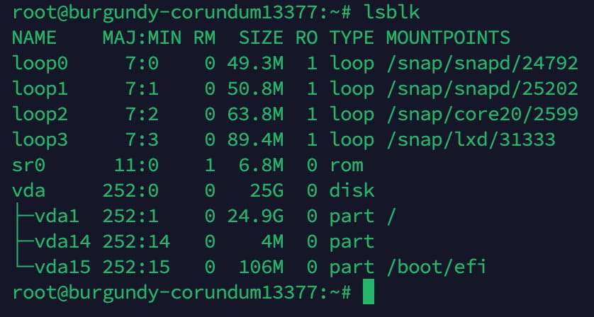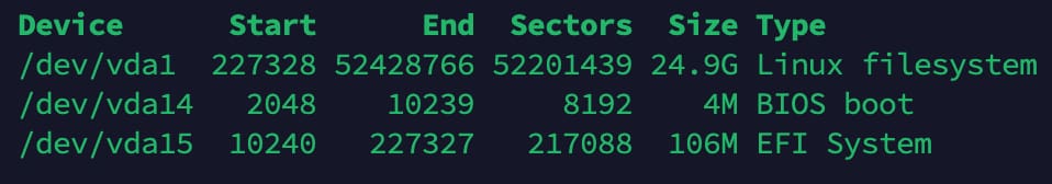 /dev/vda1 2048 52428766 52426719 25G Linux filesystem